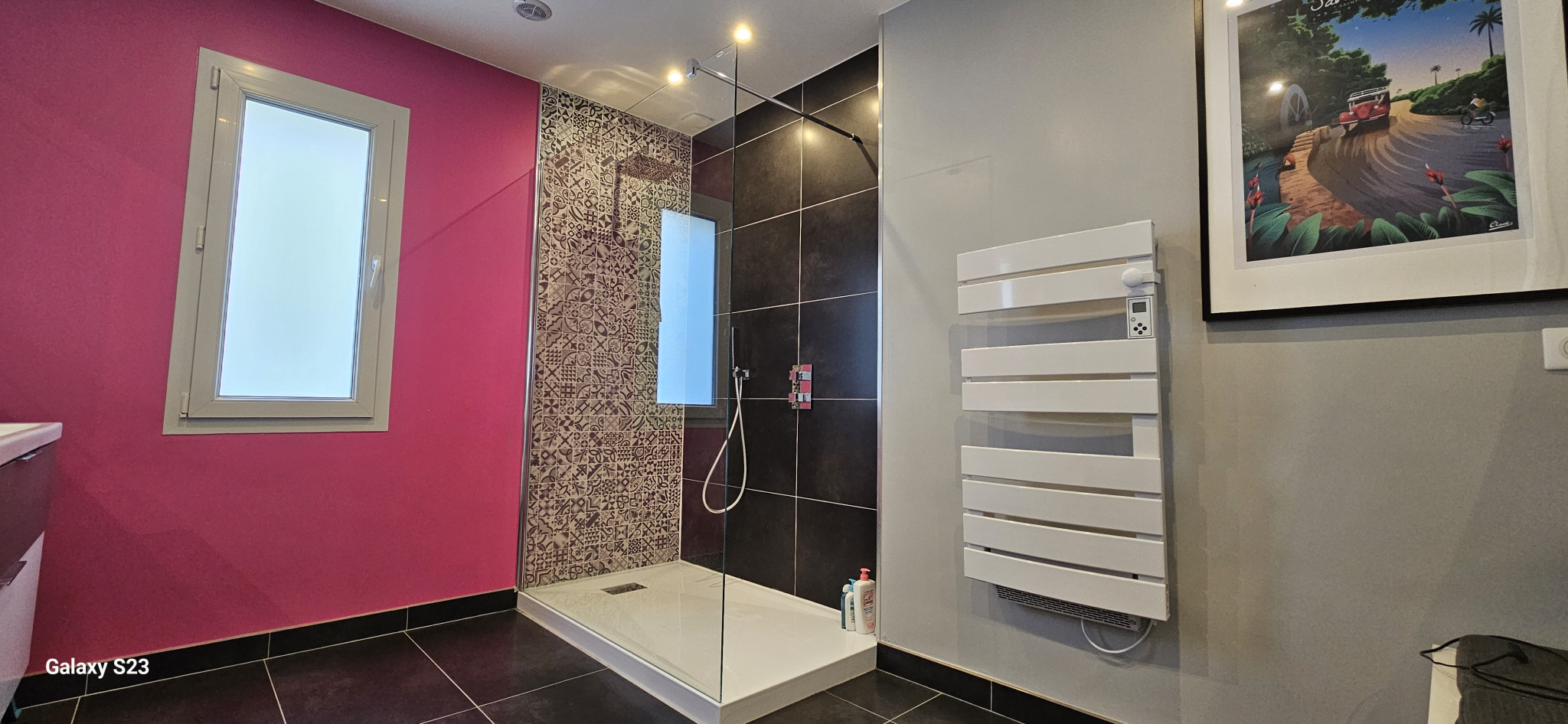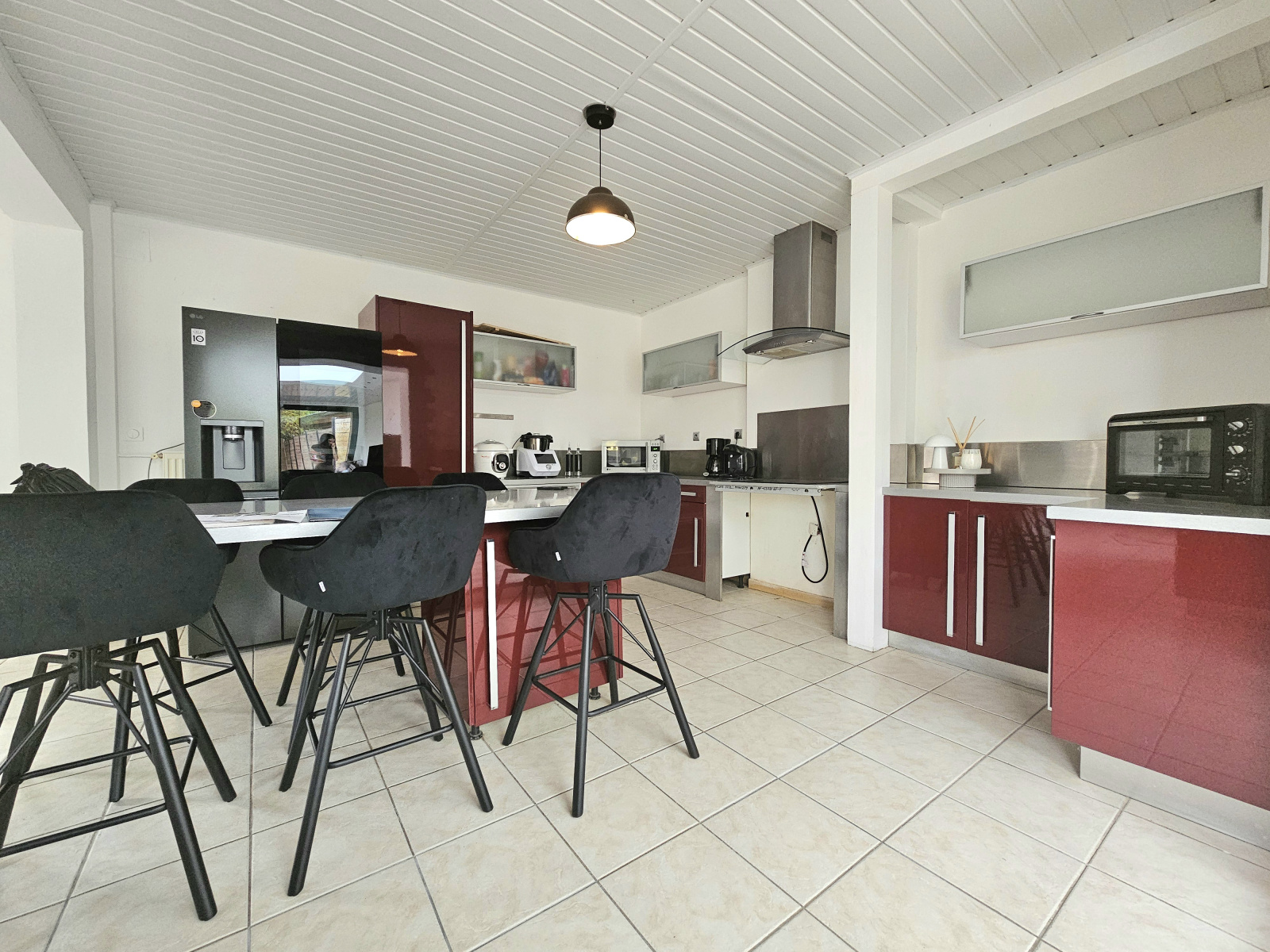 Elle se compose au rez-de-chaussée d'une entrée avec rangements, d'une vaste cuisine dinatoire aménagée, un séjour de 37m² très lumineux grâce à un puits de lumière, d'une chambre d'environ 16m², un dressing, une salle d'eau et WC séparés.