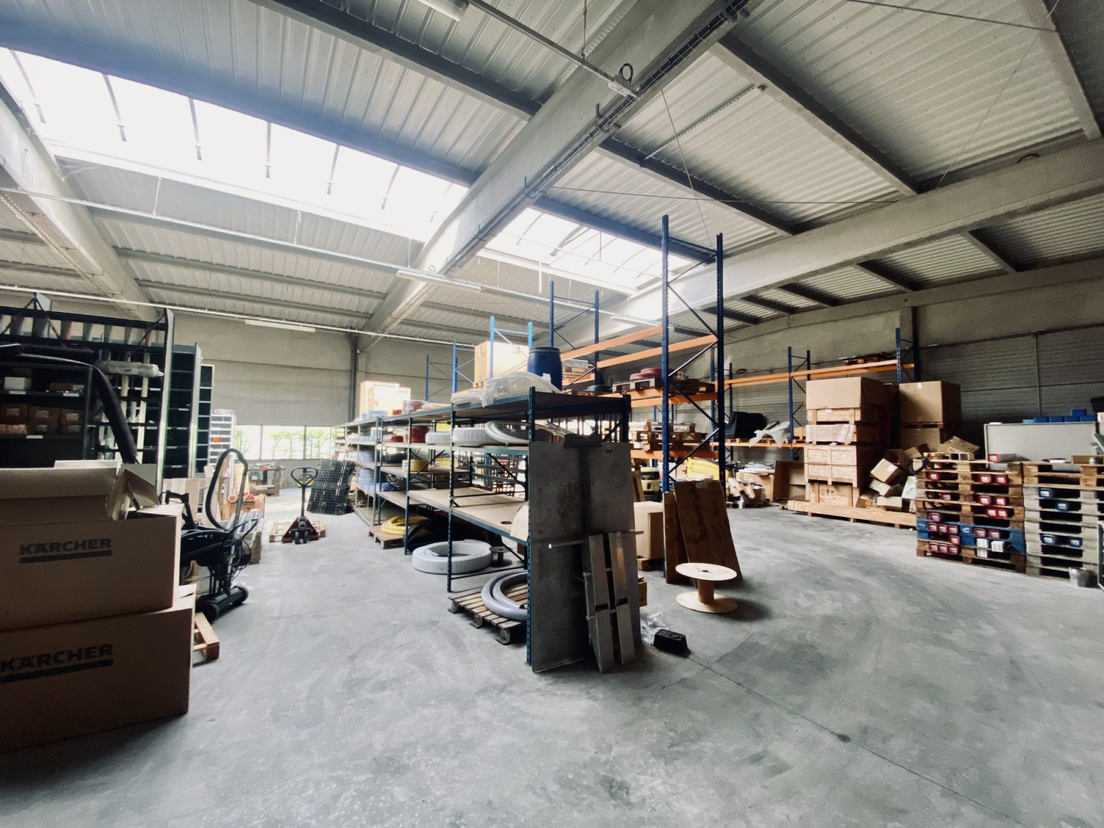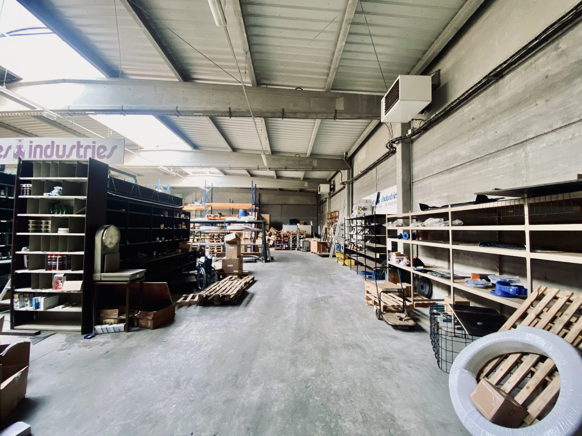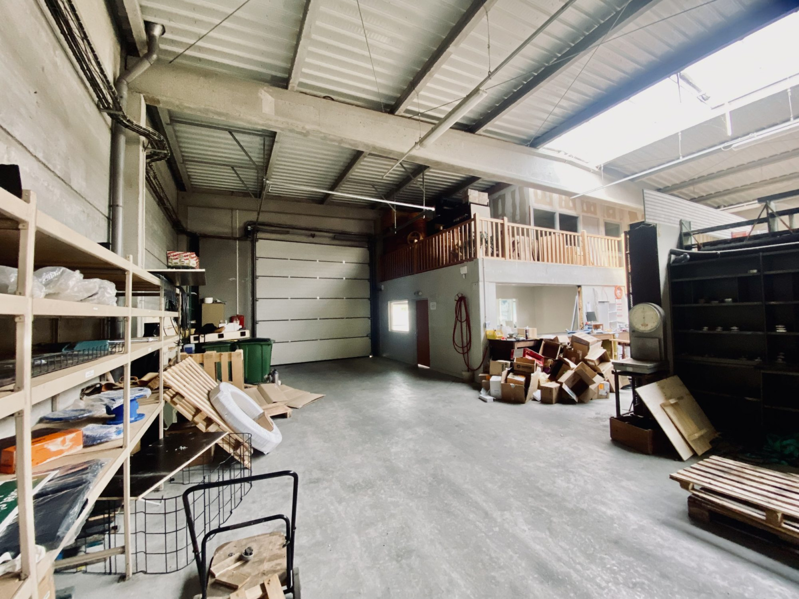 Le sol est en béton industriel adapté à une activité de stockage ou artisanale.