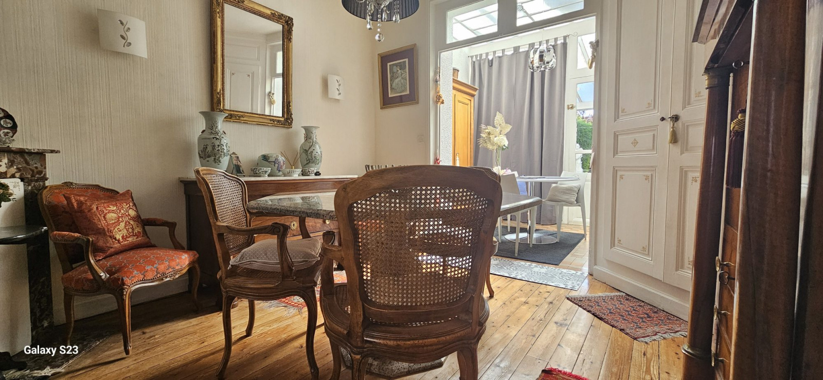 Ce bien se compose au rez-de-chaussée d'une entrée avec carreaux de ciment, d'un double salon/séjour avec parquet et cheminées, d'une cuisine séparée et d'une charmante véranda qui donne accès à une terrasse exposée sud entièrement couverte d'environ 20m².